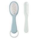 Peigne et brosse bébé.Système de rangement du peigne intégré au dos de la brosse : gain de place dansle sac ou le vanity.Produit 2 en 1 : brosse aux poils en nylon ultra-souples et très doux et peigne antinoeudsintégré.› Peigne et brosse de formes ergonomiques : permet une bonne préhension.› Anneau au bout du manche de la brosse : permet de suspendre l’ensemble au mur.
