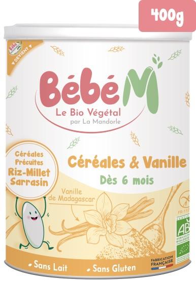 Complémentaire de la gamme infantile Bébé M (anciennement Bébé Mandorle), cette préparation infantile de céréales instantanées à la vanille est formulée à base de riz, millet et sarrasin, certifiée en Agriculture Biologique.