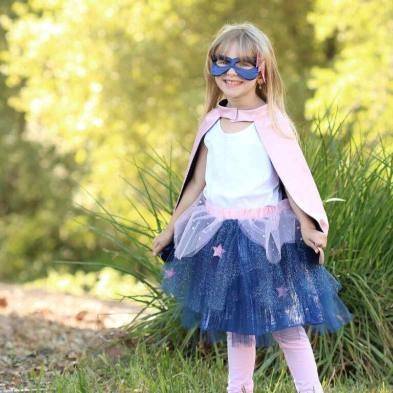 Tenue Super-héroine en rose et bleu marine avec tutu, cape et masque de la marque Great Pretenders.