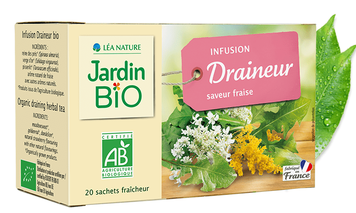 Reine des prés* (Spiraea ulmaria) 50%, verge d’or* (Solidago virgaurea) 27%, pissenlit* (Taraxacum officinale) 15%, arôme naturel de fraise* 8%.